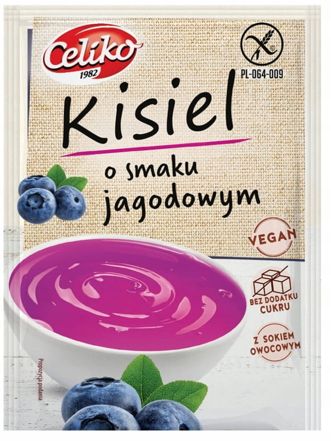 Kisiel o smaku jagodowym w proszku. Produkt bezglutenowy.